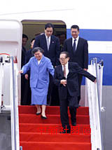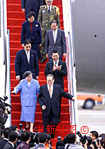 ![]() 何厚鏵陪江澤民與王冶坪下機(jī).國家主席江澤民與夫人王冶坪在澳門特區(qū)行政長官何厚鏵的陪同下,于19日下午乘專機(jī)抵達(dá)澳門機(jī)場,出席澳門回歸祖國一周年慶典活動,江澤民主要陪同人員錢其琛等同機(jī)抵達(dá)。中新社傳真 滿會喬攝 |