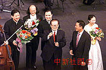 圖片:江澤民主席與全場觀眾,齊唱《歌唱祖國》 2000年12月20日 16:13 江澤民主席與何厚鏵、陳燮陽、孔祥東、莫華倫、林盈盈以及全場觀眾,齊唱《歌唱祖國》。中新社傳真 滿會喬 攝