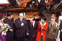 江澤民主席與錢其琛、于永波以及香港歌唱家莫華倫同臺高歌。中新社傳真 滿會喬 攝