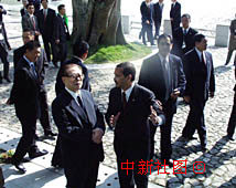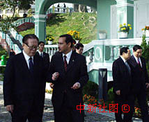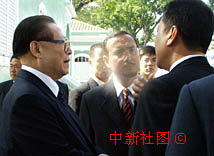 ![]() 國家主席江澤民21日上午在澳門住宅博物館聽取臨時(shí)海島市政局執(zhí)委會(huì)主席、土生葡人馬家杰介紹情況。中新社傳真 董會(huì)峰 攝 |