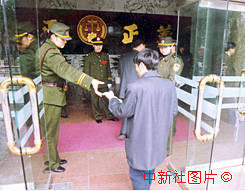 原江西省副省長胡長清一案十五日在南昌市公開宣判,審判庭約千余旁聽席坐無虛席。圖為南昌市中級人民法院的法警在第二道入場的關(guān)卡處驗(yàn)票。中新社記者 段八一 攝