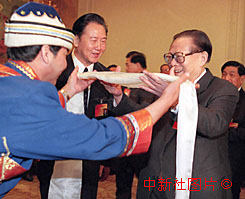 國(guó)家主席江澤民十三日到全國(guó)人大甘肅省代表團(tuán)參加討論時(shí),接受少數(shù)民族獻(xiàn)上的哈達(dá)。作者:宗金柱