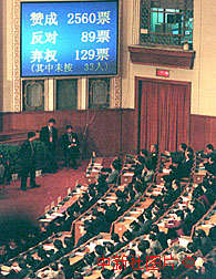 九屆全國人大三次會議十五日舉行閉幕會,以二千五百六十票贊成、八十九票反對、一百二十九票棄權(quán)通過了中華人民共和國立法法草案。該法案從今年七月一日起施行。作者:王麗南