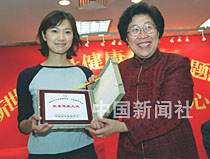 大陸正在走紅的女演員徐靜蕾,因其良好的社會(huì)聲譽(yù)和健康的形象,八日被全國婦聯(lián)授予“健康大使”。圖為全國婦聯(lián)副主席沈淑濟(jì)(右)向徐靜蕾授“健康大使”牌。中新社記者 王麗南 攝