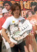 歌星陳曉東19日在香港出席「森美小儀歌劇團」成立儀式,手抱小儀紙版公仔造型。中新社傳真 鄧慶樂 攝