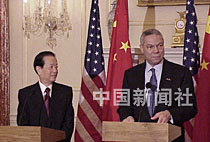 美東時間二十一日晚,中國國務(wù)院副總理錢其琛與美國國務(wù)卿鮑威爾,在美國國務(wù)院大樓舉行會談前會見記者,雙方希望繼續(xù)推進(jìn)中美兩國關(guān)系向前發(fā)展。中新社圖 京華 攝