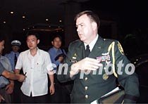 四月四日凌晨一時(shí)許,美國(guó)駐華大使館國(guó)防武官高喜樂(Gratton sealock)準(zhǔn)將在?谖娜A大酒店被中外記者追訪。他說:“我們剛剛看望了美國(guó)偵察機(jī)機(jī)組人員,他們都很健康,他們身體狀況很好。中國(guó)方面給予了妥善安排! 中新社記者 莫成雄 攝