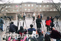 中美撞機事件引起中外新聞媒體的極大關(guān)注。四月六日,記者們在北京美國駐華大使館門前支起攝像機,安營扎寨。中新社記者 史利 攝