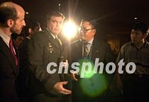 海南省政府外事僑務(wù)辦公室主任陳辭與美國駐華使館官員八日凌晨二時返回海口文華酒店,一起出席在此間舉行的新聞發(fā)布會。中新社記者 賈國榮 攝
