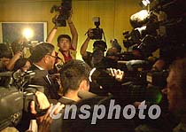 海南省政府外事辦公室主任陳辭十一日晚七時在海口文華大酒店舉行新聞發(fā)布會,宣布中國外長唐家璇接受了美國政府遞交的致歉信,引起記者包圍采訪。中新社記者 賈國榮 攝
