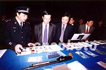 四月十一日下午,深圳市召開嚴(yán)厲打擊刑事犯罪分子宣判處理大會,法院對四十五名罪犯進(jìn)行終審宣判,公安局對三十名犯罪嫌疑人執(zhí)行逮捕。圖為廣東省委副書記、深圳市委書記張高麗(左二)和市長于幼軍(左三)等市領(lǐng)導(dǎo)在查看公安部門收繳的槍支、毒品等物。中新社記者 陳文 攝