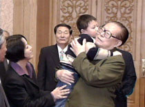 中國國家主席、中央軍委主席江澤民二十日在北京人民大會(huì)堂會(huì)見被美機(jī)撞毀戰(zhàn)機(jī)而犧牲的飛行員王偉的家屬時(shí),抱起王偉的兒子相互親吻。