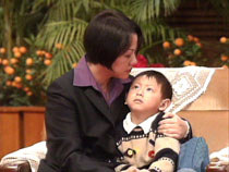 被美國軍用偵察機撞毀而犧牲的中國飛行員王偉的妻子阮國琴,二十日含淚懷抱兒子在北京人民大會堂參加中國黨政軍領導人的會見。