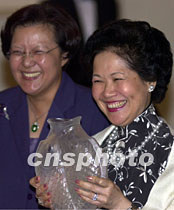 香港立法會5月3日晚為剛剛辭去政務司司長的陳方安生舉行“惜別晚宴”,立法會主席范徐麗泰代表立法會向屬“雙魚星座”的陳方安生贈送“水晶雙魚”。中新社傳真 任晨鳴 攝