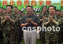 中國人民解放軍駐澳部隊六日首次參與當?shù)刂矘浠顒,圖為特區(qū)政府行政長官何厚鏵與駐澳部隊司令員劉粵軍(左)、政委劉良凱及參與植樹活動的二百名士兵合影留念。中新社記者 宗金柱 攝