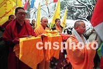 中國西藏、云南、江蘇、廣東等地的近百名僧侶二十二日在北京西山靈光寺參加紀念佛教東傳2000年大法會。中新社記者 鄒憲 攝