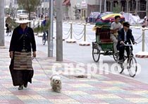 圖:藏族老大娘在彩色地磚的人行道上散步 2001年5月9日 20:11 ![]() 一位牽著狗的藏族老大娘,十三日清晨悠閑地在拉薩市新鋪上彩色地磚的人行道上散步。這條街是江蘇省支援西藏建設(shè)的項(xiàng)目之一,被命名為”江蘇路“。中新社圖 趙偉 攝