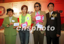 歌星容祖兒、王杰11日在香港出席「星火行動」之粵北科教新紀(jì)元助學(xué)演唱會記者會。演唱會將于5月26日晚上假廣東韶關(guān)舉行,主要籌募善款讓落后邊遠山區(qū)的兒童受惠。廣東省韶關(guān)市市政府副市長楊春芳女仕(左)頒發(fā)委任狀予星火愛心大使容祖兒、王杰。中新社傳真 鄧慶樂 攝