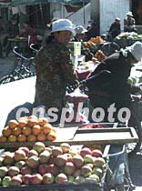 西藏拉薩五月的街頭,小販在叫賣著新鮮的水果。如今藏族人的生活水平日漸提高,購買空運(yùn)的時(shí)鮮蔬果已經(jīng)不再是困難的事情。中新社記者 滿會喬 攝