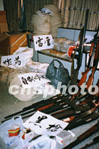 廣東廉江市公安局近日展開行動嚴厲打擊粵桂交界地區(qū)的非法制造、買賣爆炸物品等違法活動,共搗毀非法買賣炸藥窩點四個,收繳一批炸藥、雷管、導爆管等物品。圖為行動中查獲的部份黑槍和爆炸物品。中新社圖 陳祥勝 攝