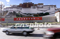 布達(dá)拉宮掛新標(biāo)語(yǔ)慶祝西藏和平解放五十周年 2001年5月23日 17:25