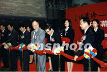 紀(jì)念西藏和平解放五十周年——《雪域珍藏——西藏文物精華展》二十六日在上海博物館開幕。上海市委書記黃菊(前右二)、市長徐匡迪(前右三)及西藏自治區(qū)主席列確(前右一)為展覽剪彩。中新社圖 姜煜 攝