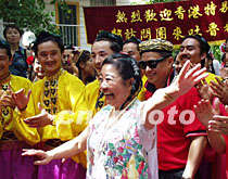 五月末在新疆吐魯番考察的香港代表團(tuán)被新疆民族歌舞吸引,華懋集團(tuán)主席龔如心裝扮獨(dú)具一格跳起舞來(lái)。中新社圖 陳國(guó)華 攝