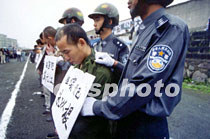 中國安徽省繁昌縣公檢法部門三十日召開“公捕公判”大會。十一名犯罪分子在 六十余名荷槍實彈的警察和武警戰(zhàn)士押解下進(jìn)入體育場并被公開宣判。中新社圖 吳芳 攝