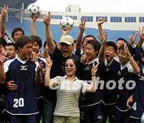 申奧路上札記之二:我們與你們同行(附圖) 2001年6月7日 13:28 ![]() 香港影星“大傻”成奎安在西安與陜西國力隊(duì)“比賽”后,連聲對(duì)媒體記者說:“好,我們一起為北京加油”。 中新社圖 魏孝明 攝 ![]() 歌手高崎6月6日下午參加鳳凰衛(wèi)視申奧車隊(duì)的“明星隊(duì)”,準(zhǔn)備與陜西國力足球隊(duì)一比高低。 中新社圖 魏孝明 攝