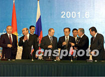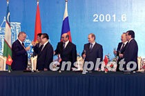 ![]() "上海合作組織"成立宣言簽字儀式15日在上海舉行,中國(guó)國(guó)家主席江澤民(右3)、俄羅斯總統(tǒng)普京(右4)、哈薩克斯坦總統(tǒng)納扎爾巴耶夫(右2)、吉爾吉斯斯坦總統(tǒng)阿卡耶夫(右5)、塔吉克斯坦總統(tǒng)拉赫莫諾夫(右1)和烏茲別克斯坦總統(tǒng)卡里莫夫出席簽字儀式。 ![]() “上海合作組織”成立宣言簽字儀式十五日在上海香格里拉飯店舉行,簽字后,江澤民主席(左二)舉杯向新加入“上海五國(guó)”并參加創(chuàng)立“上海合作組織”的烏茲別克斯坦總統(tǒng)卡里莫夫(左二)表示祝賀。中新社記者 毛建軍 攝