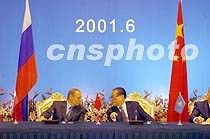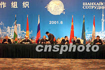 新聞組圖:“上海合作組織”成立簽字儀式 2001年06月15日 17:50 ![]() “上海合作組織”成立宣言簽字儀式十五日在上海香格里拉飯店舉行,中國(guó)國(guó)家主席江澤民與俄羅斯總統(tǒng)普京在儀式上交談。中新社記者 毛建軍 攝 ![]() “上海合作組織”成立宣言簽字儀式15日在上海香格里拉飯店舉行,中國(guó)國(guó)家主席江澤民、俄羅斯總統(tǒng)普京、哈薩克斯坦總統(tǒng)納扎爾巴耶夫、吉爾吉斯斯坦總統(tǒng)阿卡耶夫、塔吉克斯坦總統(tǒng)拉赫莫諾夫及烏茲別克斯坦總統(tǒng)卡里莫夫出席了簽字儀式。