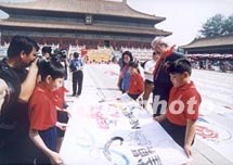 圖:百萬少年兒童繪成千米長卷申奧 2001年06月19日 19:44 ![]() 北京、上海等十二個中國城市的百萬少年兒童繪就的千米申奧畫卷,19日在北京勞動人民文化宮太廟廣場展示,吸引了許多小朋友觀看。中新社圖 胡彬 攝
