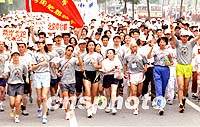 ![]() 臺灣著名運動員吳道源、彭宏年、王瀚、陳怡安、裘海正等30日在北京參加海峽兩岸為北京申奧助威長跑活動時,興奮地高呼:北京·申奧·成功。中新社記者 趙振清 攝