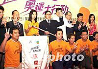 組圖:特備節(jié)目「邁向2008奧運(yùn)大行動(dòng)」舉行記者會(huì) 2001年07月05日 22:30 ![]() 無(wú)線電視特備節(jié)目「邁向2008奧運(yùn)大行動(dòng)」5日舉行記者會(huì)。韓毓霞(中)及潘芳芳(右)前赴莫斯科報(bào)道奧運(yùn)申辦投票結(jié)果,及采訪北京現(xiàn)場(chǎng)氣氛。香港體育協(xié)會(huì)暨奧林匹克委員會(huì)會(huì)長(zhǎng)霍震霆頒受「旗開(kāi)得勝」旗幟予兩人。中新社圖 鄧慶樂(lè) 攝 ![]() 特備節(jié)目「邁向2008奧運(yùn)大行動(dòng)」5日舉行記者會(huì)。香港體育協(xié)會(huì)暨奧林匹克委員會(huì)會(huì)長(zhǎng)霍震霆聯(lián)同體協(xié)會(huì)副會(huì)長(zhǎng)許晉奎、馮劉掌珠、秘書長(zhǎng)彭沖等與運(yùn)動(dòng)員許長(zhǎng)國(guó)、胡兆康及眾藝員出席頒受「旗開(kāi)得勝」旗幟儀式。中新社圖 鄧慶樂(lè) 攝
