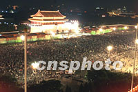 圖:天安門廣場(chǎng)人潮涌動(dòng) 2001年07月14日 07:11 ![]() 北京天安門廣場(chǎng)十三日夜人潮涌動(dòng),數(shù)以十萬計(jì)的民眾徹夜不眠慶祝北京申奧成功。中新社記者 毛建軍 攝