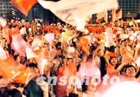 ![]() 北京各大高校的學(xué)生十三日晚在北京中華世紀(jì)壇和市民一同歡慶北京申奧成功。中新社記者 滿會(huì)喬 攝