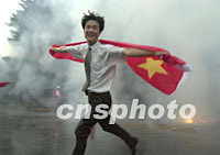 一名中國青年高舉五星紅旗,冒雨在中國駐莫斯科大使館鳴放的鞭炮煙火中狂奔,歡呼北京申辦奧運(yùn)會成功。中新社記者 賈國榮 攝