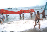 圖:青島民眾歡慶申奧成功 2001年07月16日 11:54 ![]() 北京申辦2008年奧運(yùn)會的成功也給申辦協(xié)作伙伴城市青島帶來商機(jī)。圖為青島啤酒廠職員休,假日在沙灘海浪中歡慶勝利。中新社記者 鄭萍萍 攝