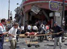 耶路撒冷爆炸:以內(nèi)政部長(zhǎng)說(shuō)十七人死亡(圖) 2001年08月09日 22:28 一名在爆炸事件中受傷的婦女正被抬上救護(hù)車。 | |||