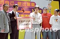 亞視行政總裁封小平(右二)與周星馳等人出席儀式,周星馳將聯(lián)同《少林足球》演員于20日踏上「百萬大道」,爭取百萬善款,該晚贏得之所有獎(jiǎng)金,將全數(shù)撥捐瑪麗醫(yī)院癌病兒童。中新社圖 吳智仁 攝