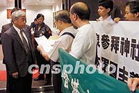 香港多個團體游行抗議日本首相參拜靖國神社 2001年08月16日 07:13 ![]() 香港多個團體15日舉行示威游行,抗議日本首相小泉純一郎參拜靖國神社。圖為香港教聯(lián)會向日本駐港總領(lǐng)事館遞交抗議信函。中新社圖 盧峰 攝