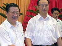 八月十五日上午,中共海南省委召開干部大會。中共中央組織部副部長黃晴宜宣布:杜青林不再擔任海南省委書記職務(wù),另有任用;任命白克明接任中共海南省委書記職務(wù)。在海南工作了九年多的杜青林與剛剛履新的白克明握手“交班”。中新社記者 關(guān)向東 攝