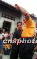 圖文:海外黃飛鴻門人到廣東佛山尋根拜祖 2001年08月28日 06:15 ![]() 南粵武林一代宗師黃飛鴻的一百多名海外弟子,27日在佛山黃飛鴻紀(jì)念館依照傳統(tǒng)武林習(xí)俗祭拜祖師黃飛鴻。他們是專程從美國、德國、瑞典等地來粵參加佛山黃飛鴻紀(jì)念館全面開業(yè)暨黃飛鴻一百四十五周年寶誕尋根拜祖等系列活動的。中新社記者 梁永強 攝 ![]() 27日,來自美國的黃飛鴻傳人、著名武術(shù)家余志偉在佛山黃飛鴻紀(jì)念館前為其洋弟子舉行隆重的入室弟子授腰帶儀式,以示對祖師的崇敬。中新社記者 梁永強 攝