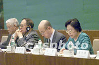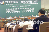 ![]() 聯(lián)合國環(huán)境規(guī)劃署官員巴克利·肯特四日在北京出席“21世紀(jì)論壇-綠色與環(huán)保2001年會(huì)議”,并作演講。中新社記者 滿會(huì)喬 攝 ![]() “21世紀(jì)論壇-綠色與環(huán)保2001年會(huì)議”四日在北京開幕,全國政協(xié)副主席葉選平(左一)、宋。ㄗ蠖⒅袊謽I(yè)科學(xué)研究院院長江澤慧(右一)等出席開幕式。中新社記者 滿會(huì)喬 攝