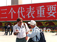圖:北京天安門廣場掛起“三個代表” 2001年09月22日 10:56 ![]() 十·一前夕,外國游客在北京天安門廣場游覽。在他們身后是為慶祝中國建國五十二周年而掛起的“認(rèn)真學(xué)習(xí)全面貫徹三個代表重要思想”的橫幅。中新社圖 張宇 攝