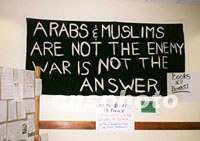 圖:美國一些校園出現(xiàn)反戰(zhàn)看板 2001年09月23日 15:32 ![]() 美國一些著名大學(xué)近日舉行和平集會,呼吁政府勿用戰(zhàn)爭手段報復(fù)恐怖襲擊事件,以免傷害無辜。圖為紐約市立大學(xué)亨特學(xué)院的看板上寫著:“阿拉伯人和穆斯林并不是我們的敵人,戰(zhàn)爭不是解決問題的辦法!敝行律鐖D |