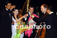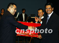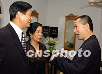組圖:周潤發(fā)出席澳門國際音樂節(jié) 2001年10月05日 18:57 ![]() 由奧斯卡金像獎(jiǎng)獲得者譚盾(右一)指揮、由多名國際音樂家和上海交響樂團(tuán)演出的"臥虎藏龍"音樂會(huì),4日晚在"第十五屆澳門國際音樂節(jié)"演出成功后,周潤發(fā)向音樂家表示祝賀。中新社圖 任晨鳴 攝 ![]() 香港巨星周潤發(fā)4日到澳門出席"第十五屆澳門國際音樂節(jié)"中的"臥虎藏龍"音樂會(huì)后,澳門特區(qū)政府社會(huì)文化司司長崔世安向周潤發(fā)頒發(fā)紀(jì)念品。中新社圖 任晨鳴 攝
