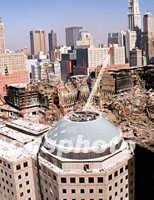 圖:紐約世貿(mào)中心斷垣殘壁 2001年10月13日 11:35 ![]() 采訪者近日從曼哈頓高處鳥瞰紐約世貿(mào)中心一號樓和周邊建筑廢墟,前面圓頂樓為世界金融中心,美林、運(yùn)通、李門兄弟等著名金融公司就設(shè)在這里!熬乓灰弧笨植酪u擊前,金融中心有天橋與世貿(mào)中心相連,“九一一”時(shí)天橋坍塌,樓頂現(xiàn)布滿建筑破損物。中新社圖 龔文謨 攝 |