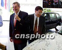 圖:通用汽車董事長史密斯比APEC其他代表多一份自豪 2001年10月17日 18:46 ![]() 上海APEC期間,有八百輛別克汽車作為禮賓及會務(wù)用車,為此美國通用汽車公司董事長史密斯比其他代表多一份自豪。圖為十七日抵達上海的史密斯在親臨上海通用汽車公司時說,當(dāng)年他第一個在上海首輛別克汽車上簽名。中新社記者 潘索菲 攝 |