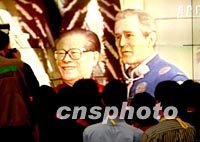 組圖:布什穿中式服裝亮相APEC峰會 2001年10月21日 11:31 ![]() 美國總統布什身穿藍色中式對襟服裝走出特制專用轎車,出席二十一日的上海APEC峰會。中外記者聚集在現場直播的電視屏幕前,進行同步報道。中新社記者 賈國榮 攝 ![]() 十月二十一日清晨,中外記者聚集在上海國際新聞中心現場直播的電視屏幕前,關注中國國家主席江澤民身著紅色中式對襟服,迎接身穿藍色中式對襟服的美國總統布什,進行出席上海APEC峰會。中新社記者 賈國榮 攝